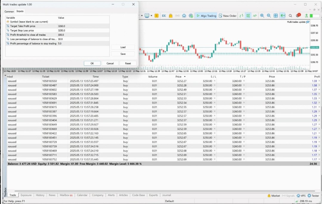 Multi Trades Update utility for MetaTrader 5 with automatic profit target, drawdown protection, and symbol-specific settings