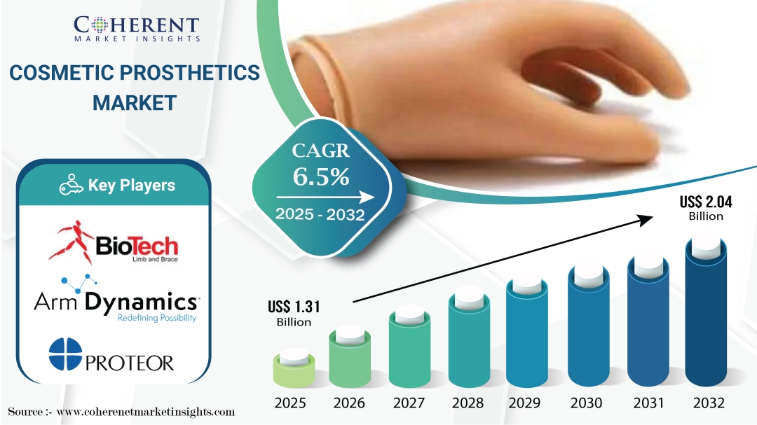 According to Coherent Market Insights (CMI), the global cosmetic prosthetics market size is projected to reach USD 1.31 Bn in 2025 and further expand at a CAGR of 6.5% during the forecast period, totaling USD 2.04 Bn by 2032.