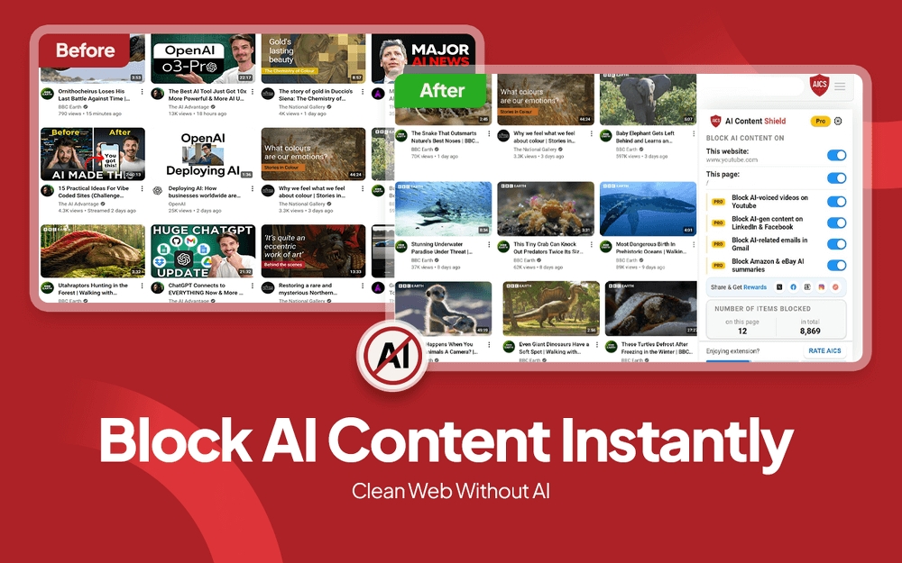 For users who want enhanced capabilities, AI Content Shield Pro adds powerful detection and workflow features for even tighter control. On YouTube, Pro enables AI-voice video detection to identify and block videos that use artificial voices, a growing trend that can be difficult to spot at a glance. Professional platform support extends this filtering capability to LinkedIn and Facebook, where Pro can block posts containing AI-generated text. In productivity contexts, Pro can filter AI-related emails in Gmail’s Social and Promotions tabs, reducing distraction and keeping inboxes cleaner. Pro targets AI-related articles on news sites that can dilute the depth and quality of reporting. In ecommerce, Pro can remove AI-generated product summaries and reviews on Amazon and eBay, offering shoppers a clearer picture grounded in real information rather than synthesized blurbs.