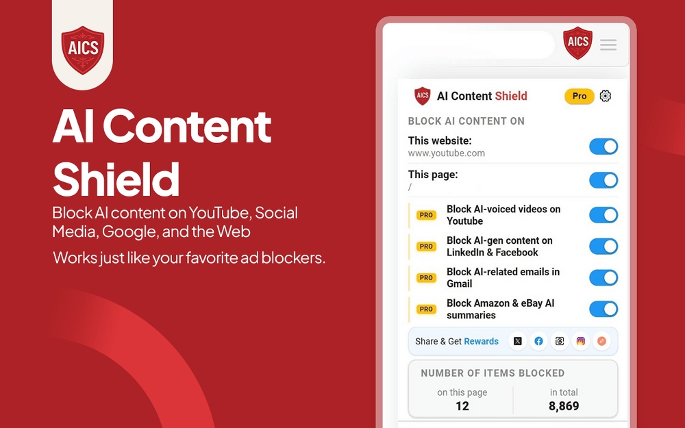 On YouTube, the extension helps users block AI-related videos from home feeds, subscriptions, channels, videos, shorts, and recommended sections, creating a cleaner, more focused video experience. For search engines, it neutralizes AI Overviews and AI Mode in Google. It removes Bing AI Summaries and Copilot Answers, restoring a traditional search experience emphasizing organic results over automatically generated content. On social media, AI Content Shield filters AI-related posts and features on X (Twitter), Facebook, Instagram, Threads, Pinterest, and Reddit, helping users maintain authentic social connections and a more topical, humancentered feed.