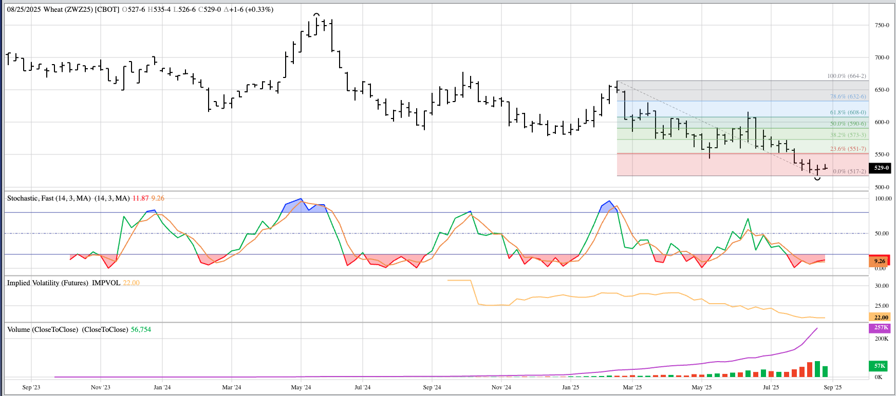 Question #3: Has SRW Wheat turned up? Maybe. I phrased the question this way because SRW is not bullish. Has not been bullish for as far back as I can recall. Yet the December issue (ZWZ25) completed a bullish technical reversal on its weekly chart last week. As I did with corn, let’s take a look at SRW wheat’s various components: