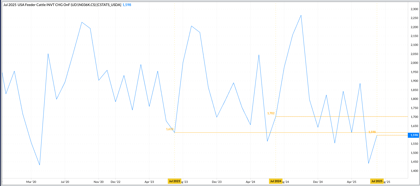Usually, I find ANY reaction to USDA’s Cattle on Feed reports humorous. Is almost as if those who should know have it wiped from their memory banks that the numbers are at least a month old upon release. The latest round showed marketings and placements that occurred during July, resulting in the number of head still counted in feed yards on Friday, August 1. For the record the report was released on Friday, August 22. It seems the BRACE Industry was squawking about how bearish the placement number of 1.598 million head was. Why? Because it was up 11% from the previous month. Okay. But it’s interesting how this group usually compares to the previous year, which in this case showed July 2025 was down 6% from July 2024 which was down 1% from 2023. In fact, last month’s year-to-year drop in placements was the most since 8% from July 2021 in relation to 2020, the latter coming with a Covid-19 asterisk.