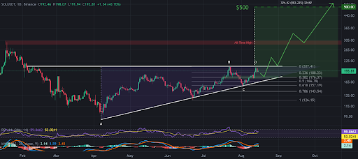 Solana price’s technical analysis shows an ascending triangle pattern with a breakout point at $207. According to analysts, this ascent could set the stage for a possible climb back to all-time highs around $300 or even $500.