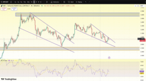 The XRP/USDT chart indicates the presence of the falling wedge pattern, which is usually a bullish reversal pattern. Ripple continues to test a support zone at around 2.70-2.80 and a rebound off this level could trigger a bullish move. Nonetheless, XRP is experiencing resistance levels around $3.20-$3.30, above which price has been unable to sustain in the past.