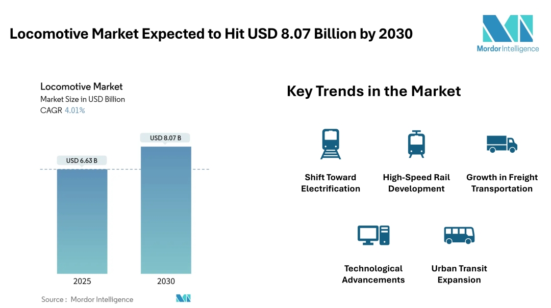 According to a 2025 report on the Locomotive Market by Mordor Intelligence, the global market size is valued at USD 6.63 billion in 2025 and projected to reach USD 8.07 billion by 2030, growing at a CAGR of 4.01% during the forecast period.