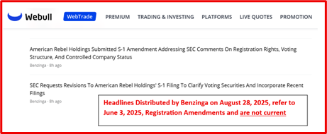 Nashville, TN, Aug. 28, 2025 (GLOBE NEWSWIRE) -- American Rebel Holdings, Inc. (NASDAQ: AREB; AREBW) (“American Rebel” or the “Company”) today issued a clarification regarding an erroneous August 28 media post that insinuated the Company was filing a new amended registration statement on Form S-1. A syndicated item on the Webull news feed reflected the same incorrect implication. The Company confirms that no amended S-1 was filed today and that any August 28 references to such action are inaccurate. This mischaracterization may have caused confusion among investors or triggered unnecessary volatility. The report did not clarify that the registration statement had already been processed and was part of previously disclosed materials.