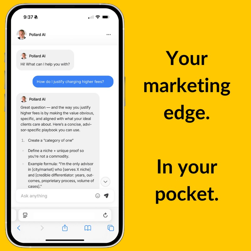 Pollard AI is designed to be the go-to marketing coach for financial advisors. Every piece of advice generated by Pollard AI is grounded in proven, practical strategies developed over years of real-world experience. With Pollard AI, financial advisors gain access to expert insights that help them grow their businesses, all in a matter of minutes.