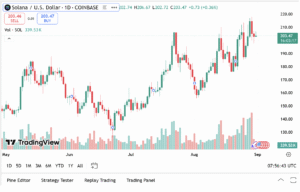 Solana is trading at $203.67, down by 0.64% in the last 24 hours, having a market capitalization of $110.15 billion and a volume of $5.28 billion. These figures indicate an established market where liquidity is controlled by large holders and less prone to short-term explosive returns.