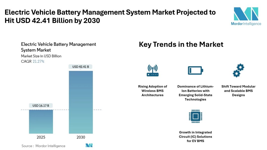 Mordor Intelligence, in its latest Electric Vehicle Battery Management System Market report, forecasts that the market size is estimated at USD 16.17 billion in 2025 and expected to reach USD 42.41 billion by 2030, at a 21.27 % CAGR