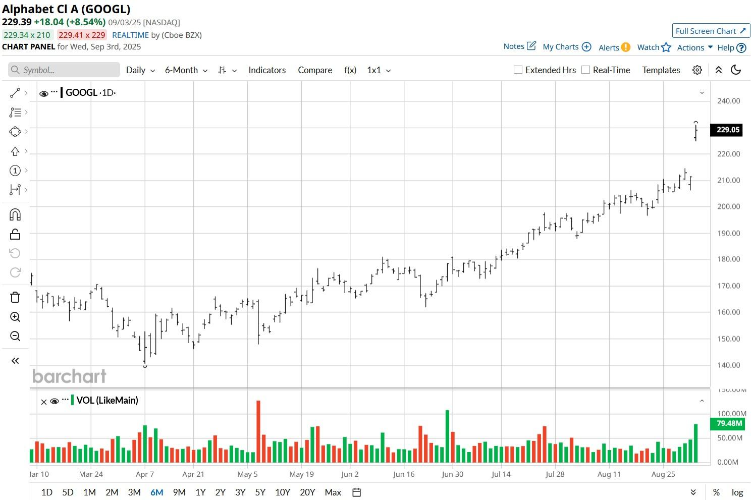 Today’s rally in Google stock builds on the massive gains it has already notched over the past four months. Versus early April, the so-called “Magnificent 7” stock is now up well over 60%.