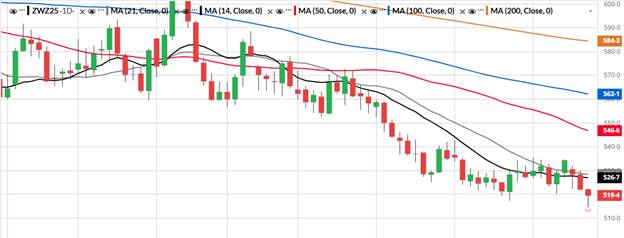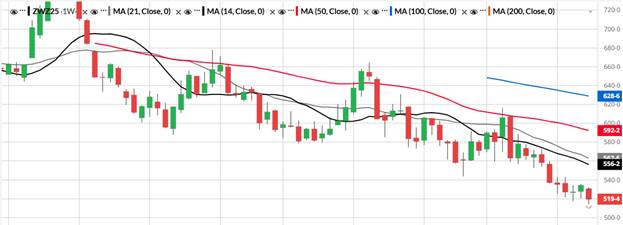 Wheat is currently on its fourth week in a row of closing lower making the charts look pretty ugly. We will get exports tomorrow morning so we will see if that brings any buying interest and any also keep an eye on any tariff news.