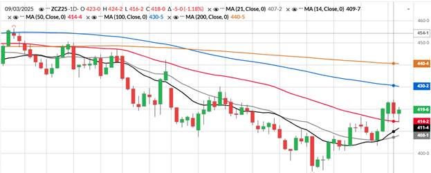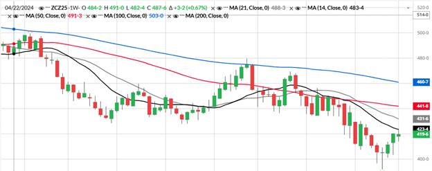 Looking at the weekly charts for December corn we have resistance at this week’s high of 424 ¼ then the 21 day moving average which is 431 ¾. Support is coming in at 403. (see chart below).