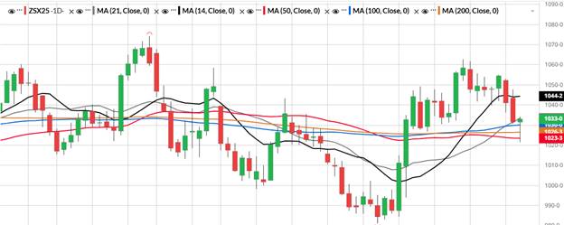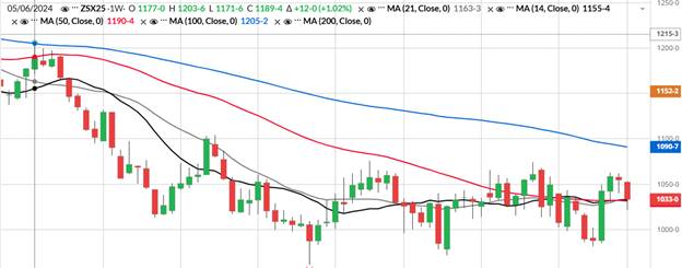 November beans traded both sides of unchanged today and held recent support at the 50 day moving average which is 1023 ¼ to close higher on the day. Exports will be delayed until tomorrow because of the holiday trading week. Looking at the moving averages on the daily charts in November beans we have the 50 day (1023 ¼) 200 day (1026 ¼) 100 day (1030) 21 day (1033) and lastly the 14 day moving average at (1043 ¾) which we will be using as resistance. (see chart below)