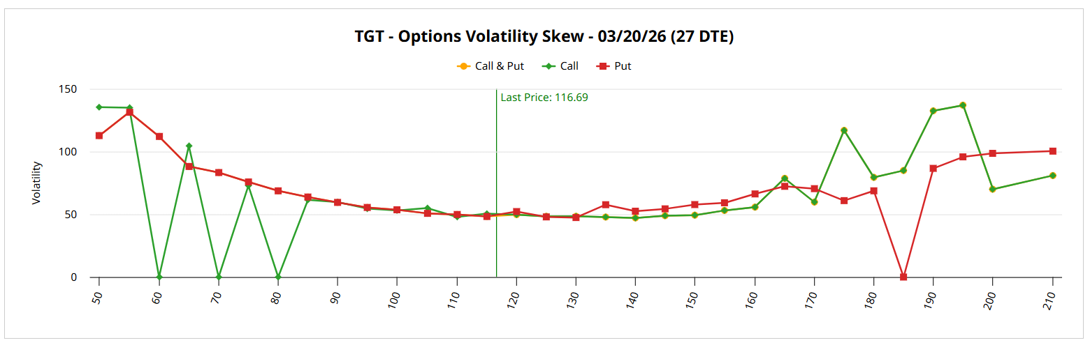 That’s all fine and well but what’s really striking is the volatility skew. For the March 20 expiration date, TGT stock enjoys a relatively normal surface-area distortion. For example, in the strikes near the spot price, the skew is relatively flat and calm, with the IV spread between calls and puts being extremely tight. This setup indicates little urgency among smart money traders to aggressively hedge the strikes likely to be triggered due to close proximity.