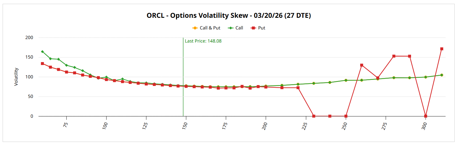 For me, ORCL stock may represent a case of information by omission. When you look at the volatility skew for the March 20 expiration date, you won’t find what you would typically expect from a badly stumbling security: panicked hedging. For strikes near the spot price, the skew is quite calm and flat, indicating no real urgency to protect against corrective pressure on strikes that are likely to be triggered due to proximity.