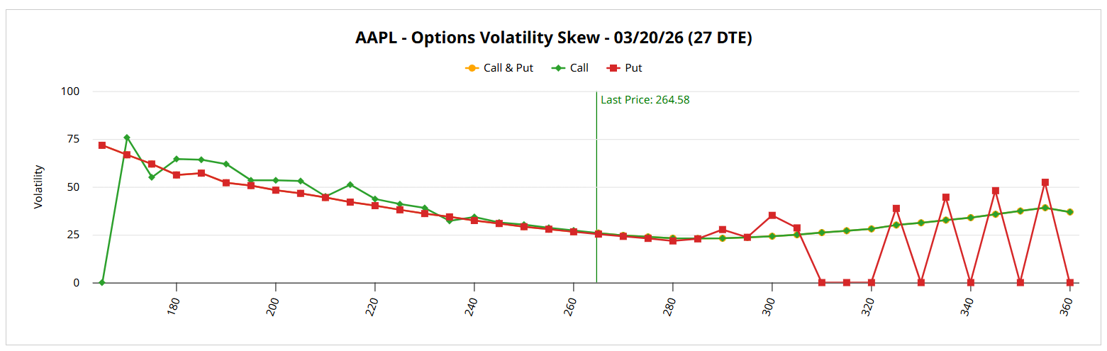 What’s enticing about AAPL stock is its volatility skew, particularly for the March 20 expiration date. First off, there’s no real urgency for the strike prices that are most likely to be affected due to close proximity to spot. Around this area, the skew is relatively calm, suggesting no robust hedging either way. It’s on the edges that things get intriguing.