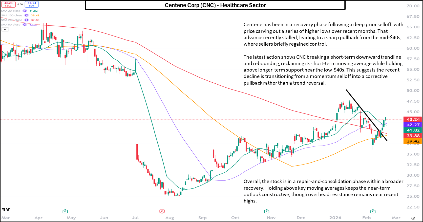 Centene represents a different profile: a stock in repair following a deep selloff, now transitioning into a recovery and consolidation phase. After rebounding sharply off its lows, CNC recently pulled back from the mid-$40s, forming a short-term downward channel.