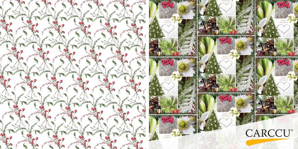 Beyond the holiday collection, Carccu continues to provide custom-printed flower wrapping paper. Florists may order paper featuring their own logo, turning each bouquet into both an arrangement and a branded delivery. Printing is available in different formats, with water-based inks and halftone techniques used to achieve detailed results. Carccu also offers design support for florists developing customized papers.