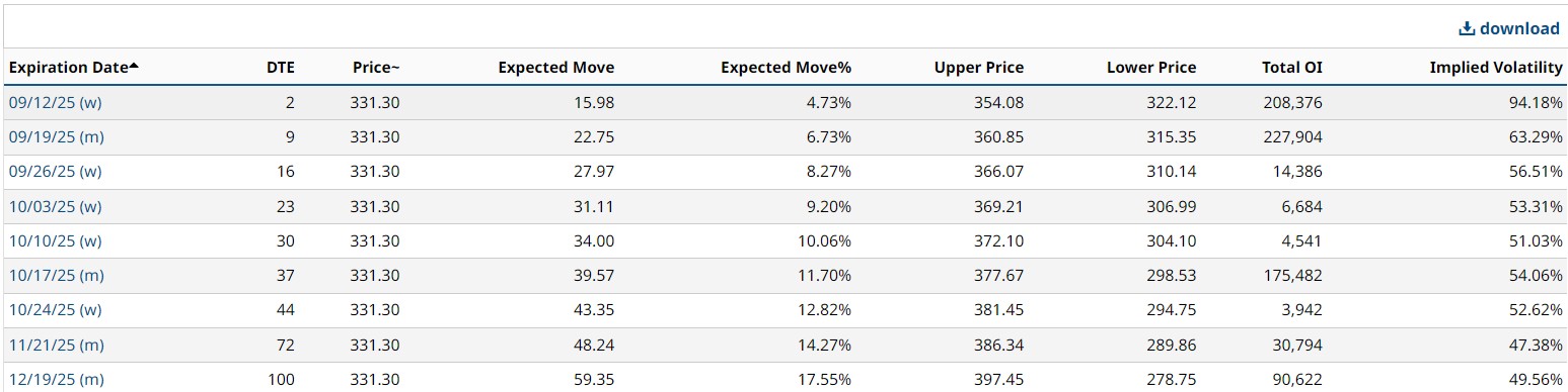 Looking out to December, the forecast calls for a 17.55% move in ORCL shares. That would translate to a continued rally up to $397.45, based on current prices, or a pullback to $278.75.