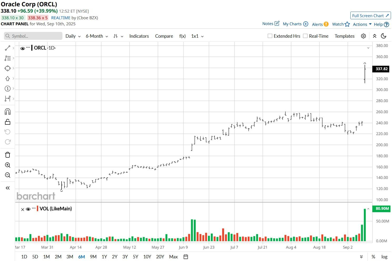 Including today’s surge, Oracle stock is up nearly 200% versus its year-to-date low set in early April.