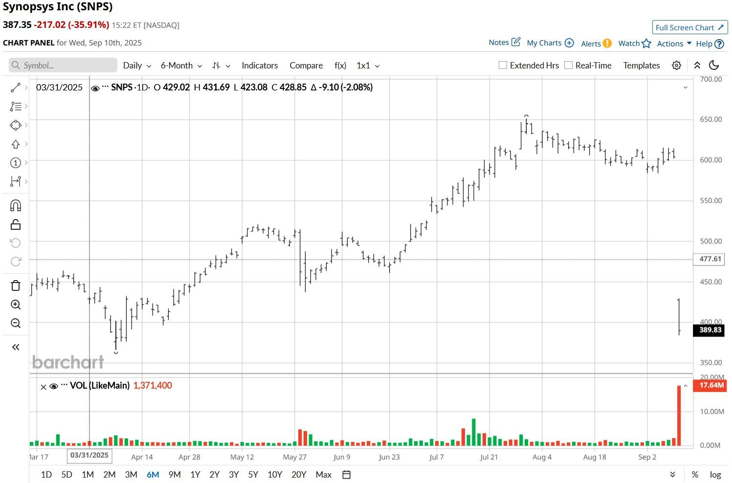 Following the post-earnings plunge, Synopsys stock is down roughly 40% versus its year-to-date high set in the final week of July.
