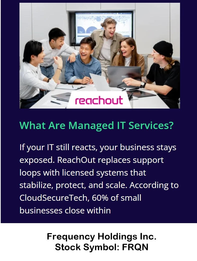 Frequency Holdings (Stock Symbol: FRQN) is a modern holding company focused on high-growth ventures in cybersecurity, AI, digital identity, and IT infrastructure. Through its lead operating brand, ReachOut, FRQN is building the first nationally recognized name in cybersecurity-first IT services for SMBs. Additional holdings, including TRUSTLESS, are structured to contribute long-term equity value via independent growth and strategic alignment.