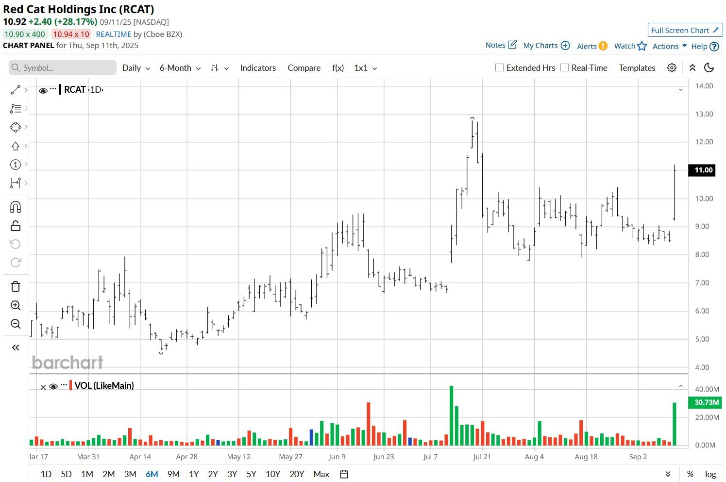 According to Barchart, options trader are pricing in a 5.42% move in Red Cat shares through the end of this week, which would place them around $11.57 on the upside and $10.38 on downside.