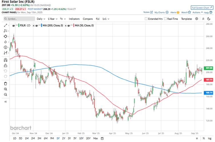 Underscoring strong momentum, First Solar’s stock is trading higher than its 50-day and 200-day moving averages since late July.