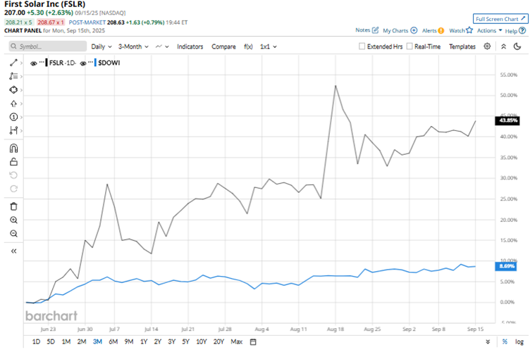 First Solar’s stock last reached a 52-week high of $262.72 in September 2024, but is now down 21.2% from this high. It had reached a 52-week low of $116.56 in April 2025, but is now up 77.6% from this low. Over the past three months, the company’s stock has gained 18.2%, while the broader Dow Jones Industrial Average ($DOWI) has been up 8.7% over the same period, which shows a clear outperformance.
