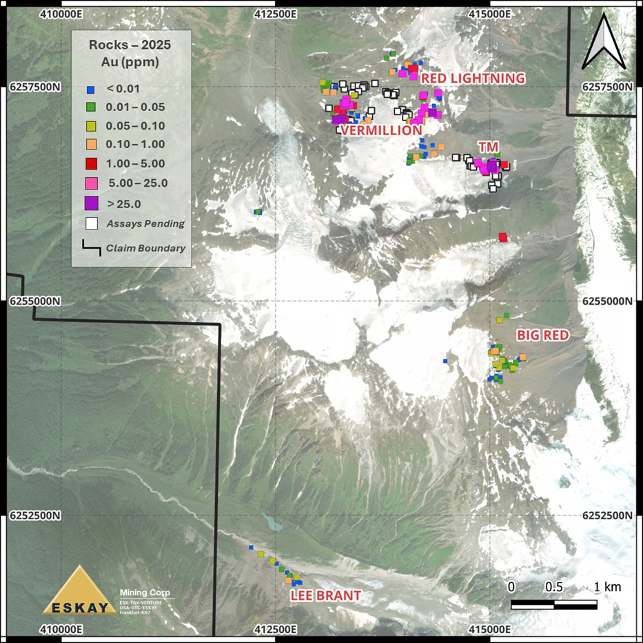 TORONTO, ON / ACCESS Newswire / September 17, 2025 / Eskay Mining Corp. ("Eskay" or the "Company") (TSXV:ESK.VN)(OTCPINK:ESKYF)(Frankfurt:KN7.GF)(WKN:A0YDPM) is pleased to provide initial assay results from its prospecting and sampling program at its 100%-controlled Consolidated Eskay Project in the Golden Triangle, British Columbia. The Company's geological team, through systematic prospecting and sampling, has significantly expanded the area where high-grade gold veins were discovered in 2024. Samples from areas including Vermillion, TM, Red Lightning, and Big Red, zones surrounding Unuk Finger Mountain in the southern extent of the Property, have all yielded numerous high-grade assays.