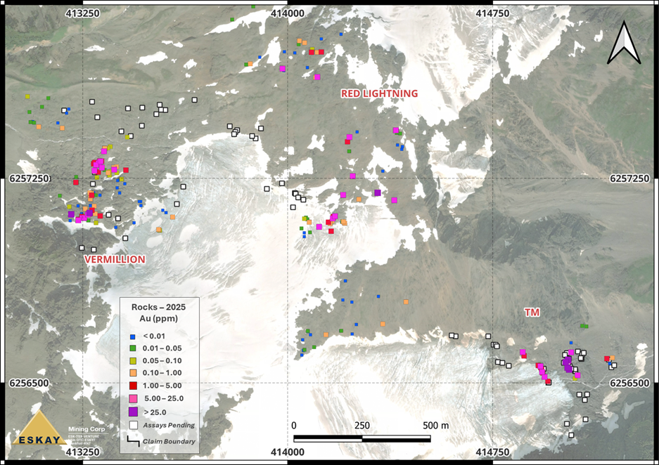 Figure 3. 2025 rock sample assays for gold from Vermillion, TM, and Red Lightning zones.