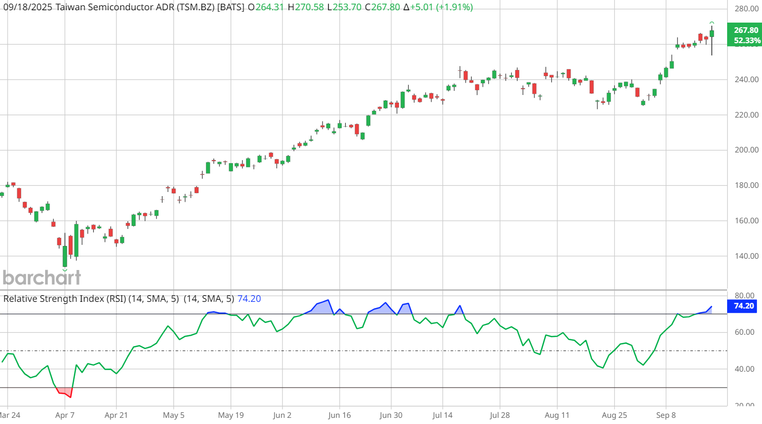 TSM stock ramped to a new high of $270.54 earlier, extending its 2025 gains to 35.5%. The 14-day Relative Strength Index (RSI) of 74 is firmly in overbought territory.