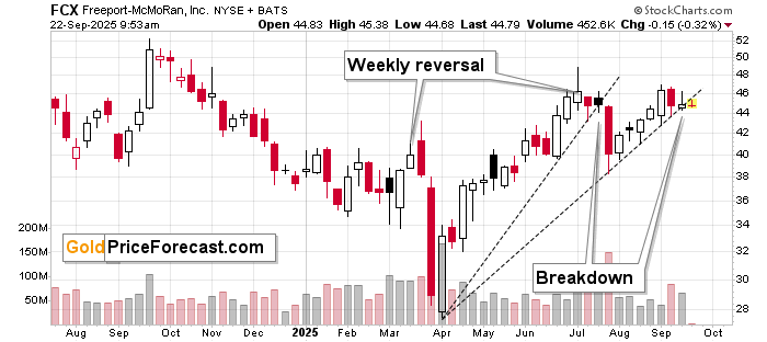 In fact, FCX just broke below its rising support line based on this year’s lows.