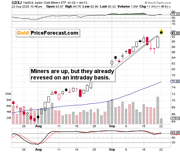Speaking of reversals, that’s what miners are doing on an intraday basis. Perhaps this two-day rally is the final breath of the dying bull. We’ll see soon, but even if this is not the case immediately, it still seems that miners’ rally’s days are numbered.