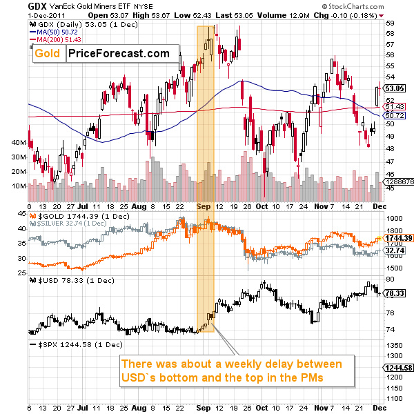 Back in 2008, neither gold, nor miners, topped right when the USD Index bottomed. They PMs top was delayed by a few days. In particular, miners topped about a week after the USD Index did.