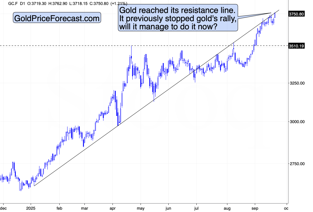 Gold price is up – once again at the rising resistance line. This is the third time that it reached it. This time, it also moved to the psychologically important $3,750 level.