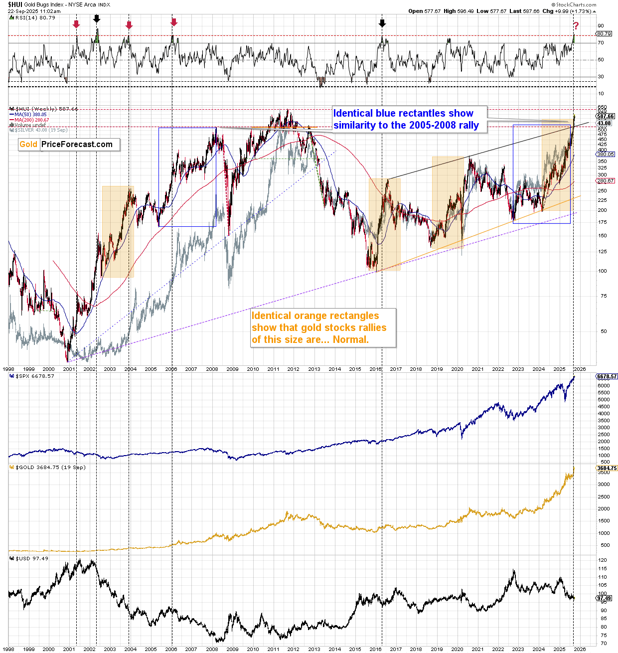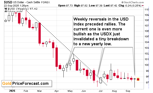 The same kind of reversal that meant local bottoms in April and in June. The difference now is that this is the second bottom, which what used to start huge rallies in the past, but I already wrote about it [on Thursday] – the thing that I want to add on top of that is that the USD Index is UP this week. This makes the implications of the current situation here even more bullish – extremely so.