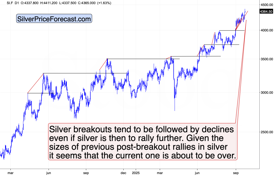 Silver is up, and it even briefly moved above the price level marked by the highest of the red lines – that’s how far silver rallied after previous breakouts. It now moved back below this level, perhaps while creating a daily reversal.