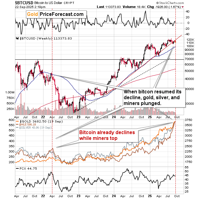 About three years ago, when bitcoin was after its final top, it had a correction after the first part of the decline. The end of the correction in bitcoin preceded the top in the precious metals sector.