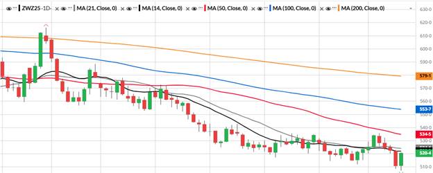 December wheat closed the day higher after making a new contract low of 507 ¼. Resistance on the daily charts come in at 523 which was yesterday’s high then the 21-day moving average of 524. For support I am using 507 ¼ which is the contract low then the psychological level of $5. (see chart below).