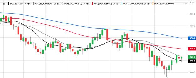 Looking at the weekly charts for December corn we have resistance at last week's high of 431 ¼ and followed by the 50day at 440 ¼. For support I am using 415 and then 403 ½. (see chart below).