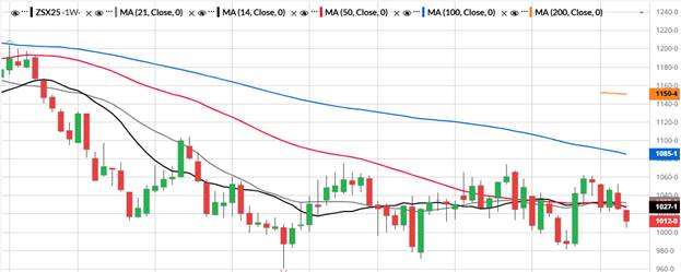 Looking at the weekly charts for November beans we have resistance at 50 day moving average of 1028 then the 21 day which comes in at 1032. For support I am using the $10 level then 984 ½. (see chart below).