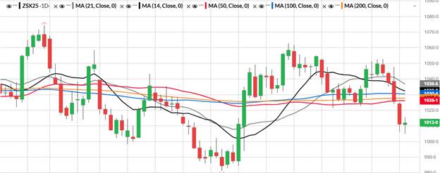 November beans closed the day higher even with continued weakness by soybean meal. November beans are now on a 40 plus cent break from the recent highs and through most of support. I am using the psychological $10 level then followed by 994 as support on the daily charts. As far as resistance goes, we have yesterday’s high at 1025 followed by the 50day moving average at 1026. (see chart below).