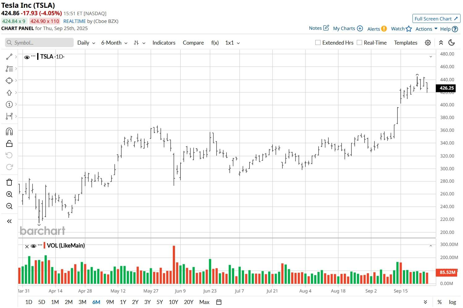 According to Barchart, the consensus rating on Tesla shares sits at “Hold” only with the mean target of about $317 indicating potential downside of roughly 25% from here.