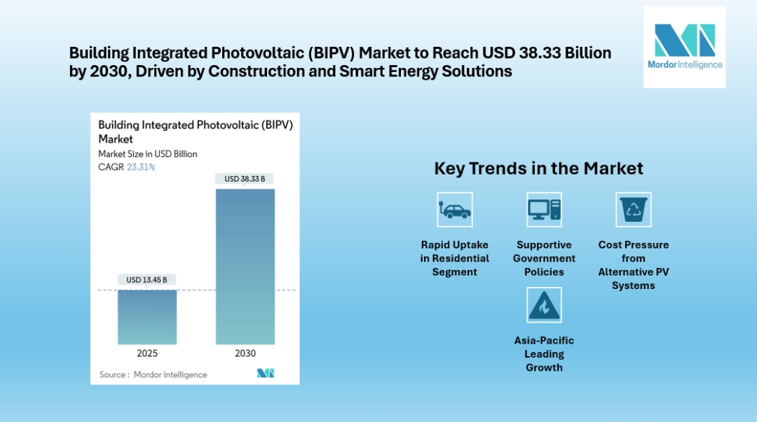 The global Building Integrated Photovoltaic (BIPV) market is entering a robust growth phase, driven by increasing demand for clean energy solutions and rising interest in integrating solar capabilities directly within building structures. According to Mordor Intelligence, the BIPV market is projected to grow from USD 13.45 billion in 2025 to USD 38.33 billion by 2030, registering a compound annual growth rate (CAGR) of approximately 23.31 % over this period.