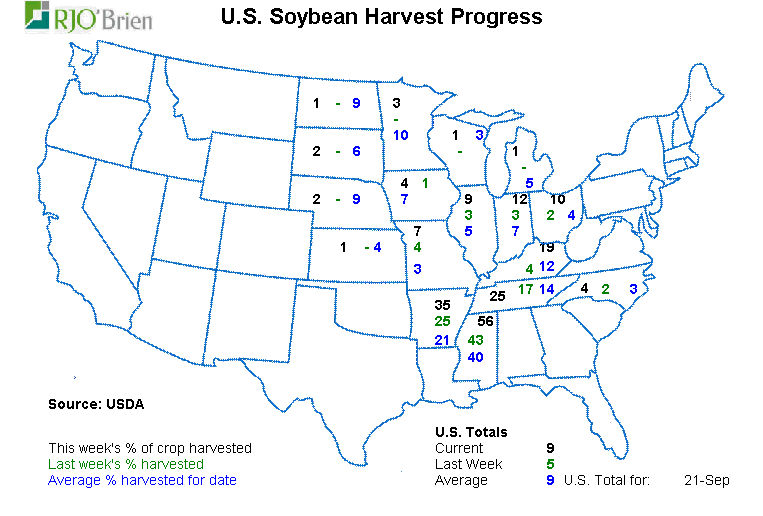 This will be timely for corn harvest getting started in the Midwest while soybeans will now begin to dry down quickly and start shedding leaves. Such conditions are not ideal for late soybeans filling and we’ve heard more about at least one or maybe two of three seeds in the pods being small. I’m expecting quite a lot of variability seed size in later soybean varieties.