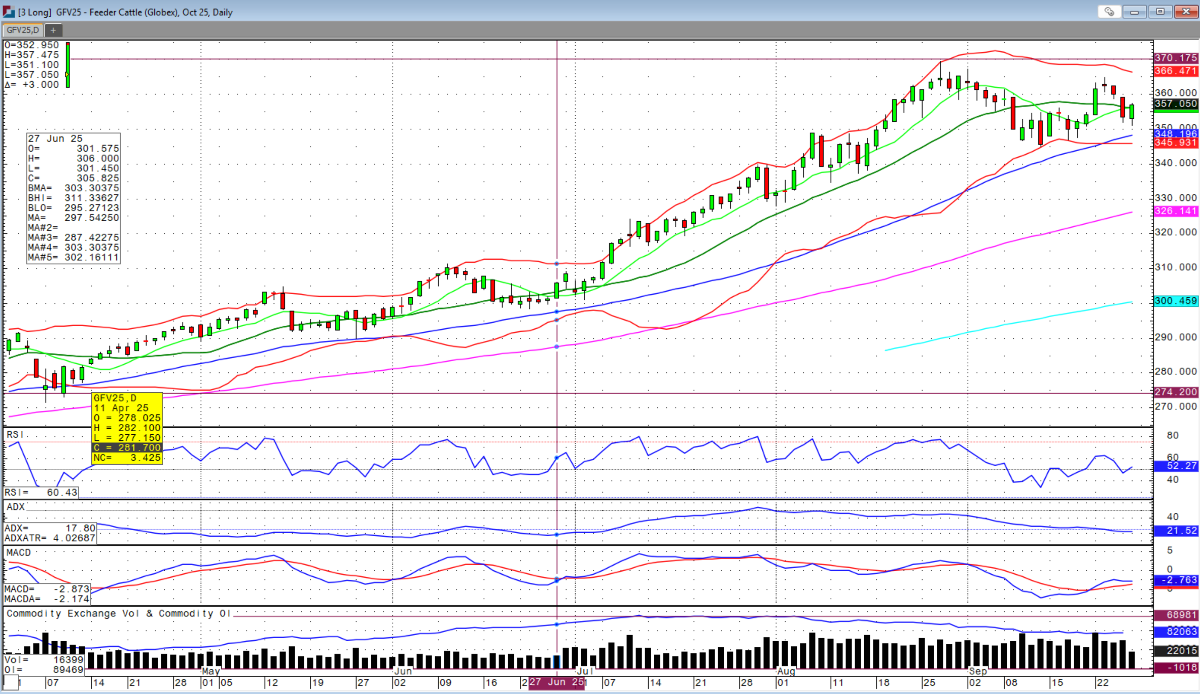 We’ve now put in a lower high and so we will have to see if the high on August 27th was the high or if we are going to try again. Regardless, expect volatile, two-sided trade as this market whipsaws among headlines and movements in the equity market and managed money fund flow. And don't forget about that chart gap from April 11th all the way down at $282.100 on October feeders, which seems an eternity away. September feeder futures and options expired Thursday at $365.400, which was a premium to the CME Feeder Index.