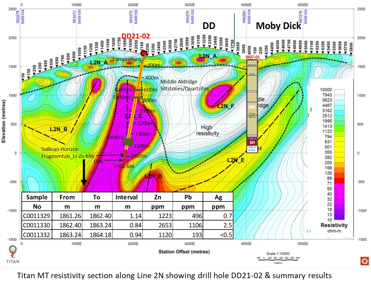 - In addition to the MT targets, historic drill hole IR07-01, drilled 2300m east of DD21-01, intersected approximately 149m of moderately to highly hydrothermally altered Sullivan sediments at 1365m with up to 0.5% Zn and up to 0.3% Pb (Figure 3).