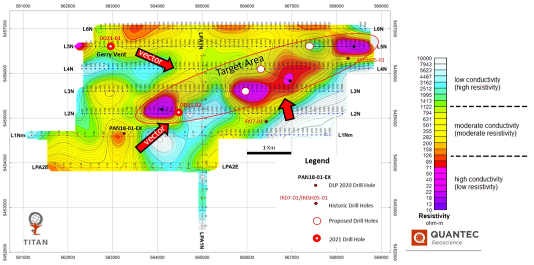 Figure 1 - Simplified plan showing MT anomalies at 0m elevation on the DD-Moby Dick and NZOU Properties along with drill holes Pan-18-01EX, DD21-01, DD21-02 and historical holes Irish 05-01 and IR07-01.