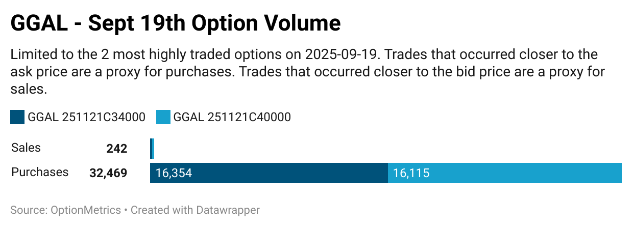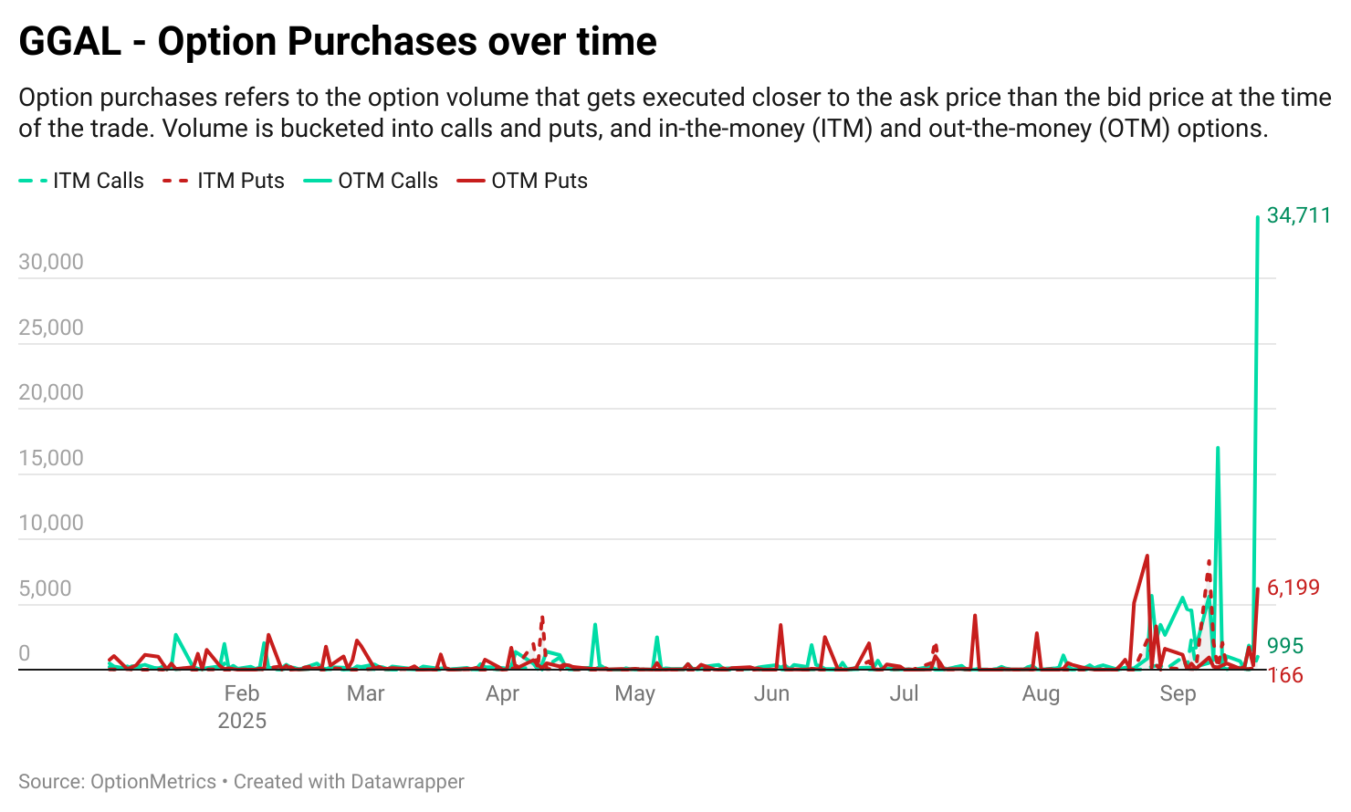The graph above sums these option purchases into four groups: out-of-the-money (OTM) call options, OTM put options, in-the-money (ITM) call options, and ITM put options. Purchases across these four groups provide different sentiments: buying call options is obviously bullish, and if they are OTM it is even more so as these are more lottery style options. The volume on GGAL options stayed relatively consistent for most of 2025, until the huge spike on Friday September 19th where the OTM call purchase volume spiked to 34,711 contracts, while all other groups remained relatively steady. This OTM call bucket often provides the most bullish sentiment when it comes to increased volume.